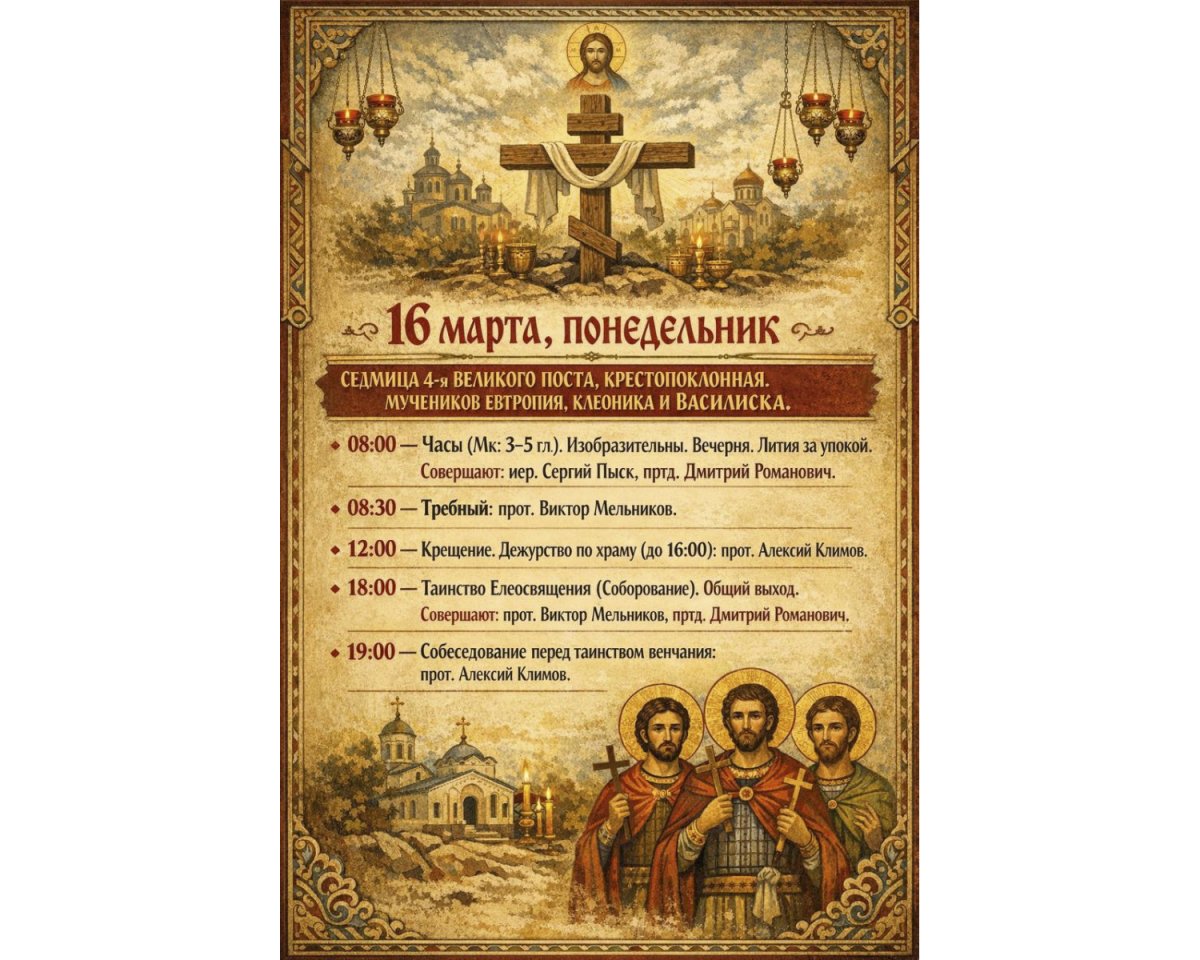 Дорогие братья и сестры, приглашаем вас на богослужения в приход иконы Божией Матери "Всех скорбящих Радость" города Минска и публикуем расписание служб на неделю, с 16 по 22 марта. 16 марта, понедельник СЕДМИЦА 4-я ВЕЛИКОГО ПОСТА, КРЕСТОПОКЛОННАЯ. МУЧЕНИКОВ ЕВТРОПИЯ, КЛЕОНИКА И ВАСИЛИСКА 8:00 Часы с чтением Евангелия. Изобразительны. Вечерня. Лития за упокой 12:00 Крещение 18:00 Таинство Елеосвящения (Соборование) 17 марта, вторник ПРЕПОДОБНОГО ГЕРАСИМА, ИЖЕ НА ИОРДАНЕ. БЛАГОВЕРНОГО ВЕЛИКОГО КНЯЗЯ ДАНИИЛА МОСКОВСКОГО 8:00 Часы с чтением Евангелия. Изобразительны. Вечерня. Лития за упокой 12:00 Крещение 18:00 Утреня великопостная. Час 1-й 18 марта, среда МУЧЕНИКА КОНОНА ИСАВРИЙСКОГО 8:00 Часы с чтением Евангелия. Лития за упокой. Изобразительны Вечерня с литургией Преждеосвященных Даров 8:30 Исповедь 18:00 Утреня великопостная. Час 1-й 19 марта, четверг МУЧЕНИКОВ 42-х В АММОРЕЕ 8:00 Часы с чтением Евангелия. Изобразительны. Вечерня. Лития за упокой 12:00 Крещение 18:00 Утреня великопостная. Час 1-й 20 марта, пятница СВЯЩЕННОМУЧЕНИКОВ ЕПИСКОПОВ ХЕРСОНЕСА 8:00 Часы с чтением Евангелия. Лития за упокой. Изобразительны Вечерня с литургией Преждеосвященных Даров 8:30 Исповедь 18:00 Утреня (парастас). Час 1-й 21 марта, суббота ПОМИНОВЕНИЕ УСОПШИХ. ПРЕПОДОБНОГО ФЕОФИЛАКТА ИСПОВЕДНИКА, НИКОМИДИЙСКОГО 8:00 Панихида 8:30 Исповедь 8:40 Часы 3-й, 6-й 9:00 Божественная литургия свт. Иоанна Златоуста. Панихида 10:30 Молебен, панихида (в храме Воскресной школы, с сурдопереводом) 12:00 Крещение 17:00 Всенощное бдение. Исповедь 22 марта, воскресенье НЕДЕЛЯ 4-я ВЕЛИКОГО ПОСТА. СВЯТЫХ 40 МУЧЕНИКОВ СЕВАСТИЙСКИХ. ВОСКРЕСЕНЬЕ ПРЕПОДОБНОГО ИОАННА ЛЕСТВИЧНИКА 6:40 Часы 3-й, 6-й 7:00 Божественная литургия свт. Василия Великого. Молебен. Заупокойная лития 9:40 Часы 3-й, 6-й 10:00 Божественная литургия свт. Василия Великого 12:00 Молебен 12:30 Панихида 13:00 Крещение 17:00 Вечерня с чтением страстного евангелия от Луки (пассия 3-я).