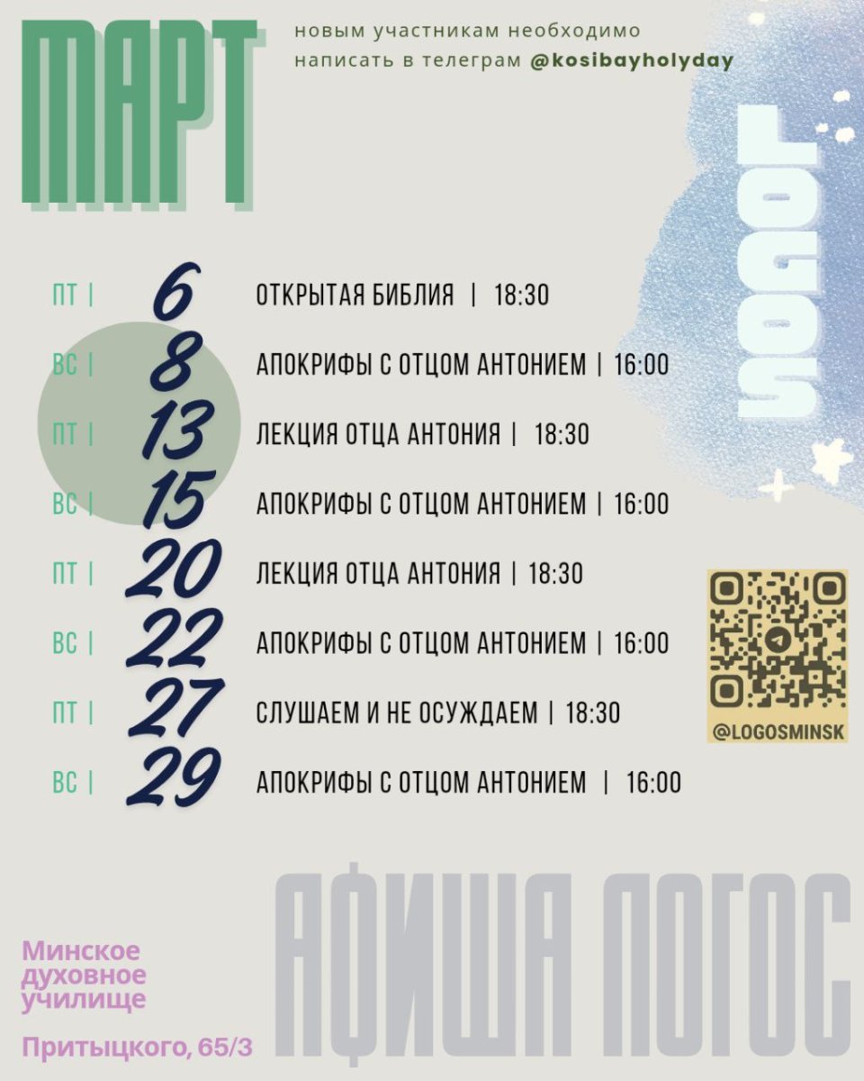 Братья и сестры, предлагаем вашему вниманию расписание мероприятий молодежно-просветительского объединения "Логос" на месяц. 6 марта - Открытая Библия, 18.30 8 марта - Апокрифы с отцом Антонием, 16.00 13 марта - лекция отца Антония, 18.30 15 марта - Апокрифы с отцом Антонием, 16.00 20 марта - лекция отца Антония, 18.30 22 марта - Апокрифы с отцом Антонием, 16.00 27 марта - слушаем и не осуждаем, 18.30 29 марта - Апокрифы с отцом Антонием, 16.00. Молодежно-просветительское объединение "ЛОГОС" прихода иконы Божией Матери "Всех скорбящих Радость" города Минска приглашает молодых братьев и сестер от 16-35 лет на встречи. Присоединиться может любой желающий. Возраст - до 35 лет. Необходимо написать руководителю группы @kosibayholyday в Телеграм. Адрес: Минск, ул. Притыцкого, 65. Читайте нас и смотрите в: Telegram, Instagram, Youtube