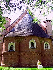 Еще один памятник храмового зодчества оборонного типа - это Благовещенский собор Супрасльского монастыря (совр. Польша). В 1503-1510гг. благодаря щедрым пожалованиям основателей мужского монастыря на р. Супрасле литовским вельможам Александру Ходкевичу и Иосифу Солтану здесь был построен великолепный храм, стены и башни которого напоминали по своему изяществу скорее дворец, чем замок. Нижняя часть собора была украшена ромбовидными кирпичами, а устремленные вверх башни венчались луковичными куполами и крестами.