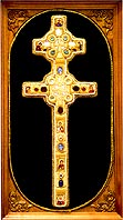 Крест Евфросинии Полоцкой. Шитье, стразы. Киот, дерево, резьба, 65 х 39,5. Инокиня Наталия. Полоцкая епархия, Спасо-Евфросиниевский женский монастырь.