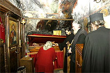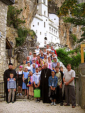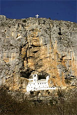 Самая главная святыня Черногории - монастырь "Острог". В нем находятся мощи одного из самых почитаемых святых Сербской Церкви святителя Василия Острожского (день памяти - 12 мая). Несмотря на опасную крутую и узкую дорогу - монастырь расположен на высоте 1695 метров над уровнем моря - ежедневно прибывают около пятидесяти автобусов. Только опытные водители рискуют ехать сюда. Нашу группу доставили в Острог на маршрутных такси. Поблагодарив святителя Василия Острожского за то, что помог нам благополучно добраться, мы один за другим приложились к его святым мощам, находящимся в раке в небольшой пещерке. В монастыре нас с великой любовью принял и благословил игумен Иоанн. В данной обители находится еще одна святыня - ручки мученика Станко, он был простой пастух. Турки заставляли его отречься от православной веры и принять ислам, но он сохранил свою веру. Тело святого было сожжено, а ручки остались в память о том, что праведники живут вечно.