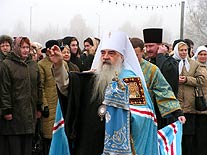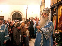 На площади перед церковью Его Высокопреосвященство хлебом-солью встречали сёстры милосердия, сотрудники церковных мастерских с умственными ограничениями, которые преподнесли владыке изделия собственных рук, многочисленные прихожане.