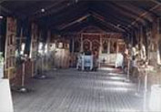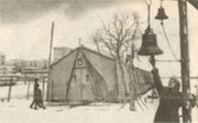 Такой интерьер | Настоятель волновался, придут ли люди на первую литургию, назначенную на Вознесение Господне. Пришло человек 25 - не так уж мало для начала. Постепенно интерьер нашего шатра обретал черты храма: отгородили алтарь иконостасом с репродукциями икон, такие же бумажные иконы появились на стенах между оконцами. Встали подсвечники. К зиме был настелен дощатый пол, сделана дверь. У входа расположилась деревянная колокольня. Колокола, как и другое церковное достояние, во время гонений прятали, а теперь доставали из тайников и передавали церквям.